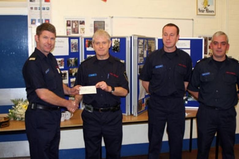 Jerry Christopher receiving a cheque on behalf of Clun Mother & Toddler Group with from left Firefighters Michelle O'Toole, Chris Morris, Michael Oliver & Shenton Gwilliam.