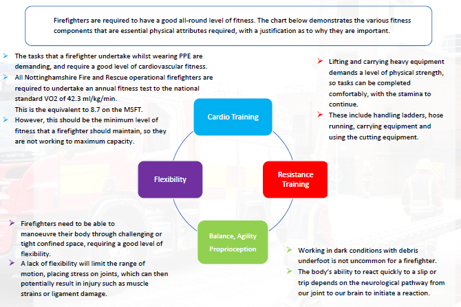 The chart below (kindly provided to us by our friends at Nottinghamshire Fire and Rescue Service) outlines why it is important for firefighters to maintain fitness and flexibility.