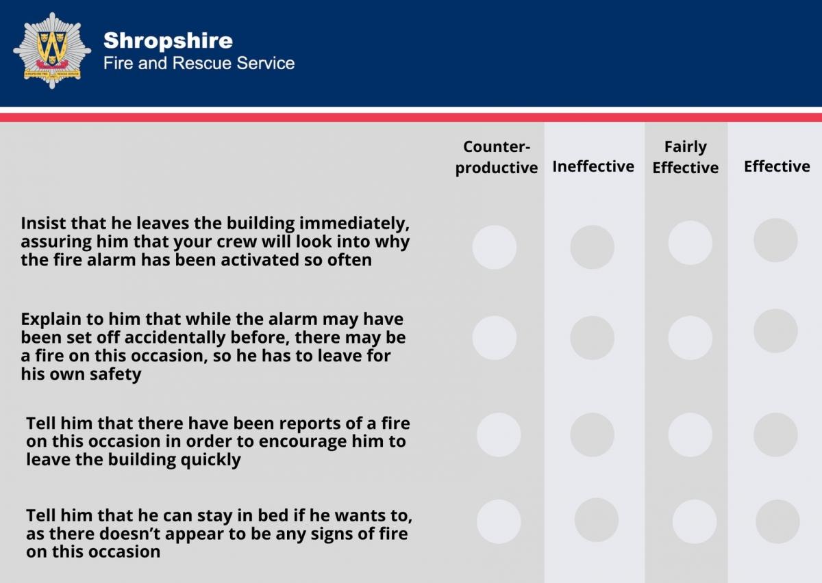 It is 2am in the morning. Your Crew has been called to a nearby sheltered housing facility as the fire alarm has gone off. There doesn’t appear to be any signs of fire, but your Watch Manager advises you and some of the crew to enter the building, to make sure everyone has been evacuated. When you get to one of the rooms, you find a young man in bed. You explain to him that he needs to leave the building. The man appears agitated and says that he is not leaving as this is the fourth time the alarm has gone off in the past two weeks and he’s sick of having to get out of bed for no reason. Rate the effectiveness of the following actions: